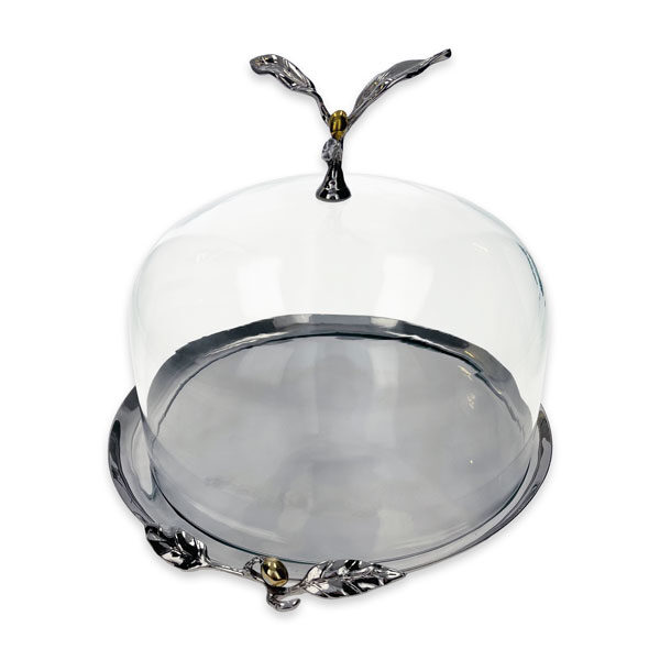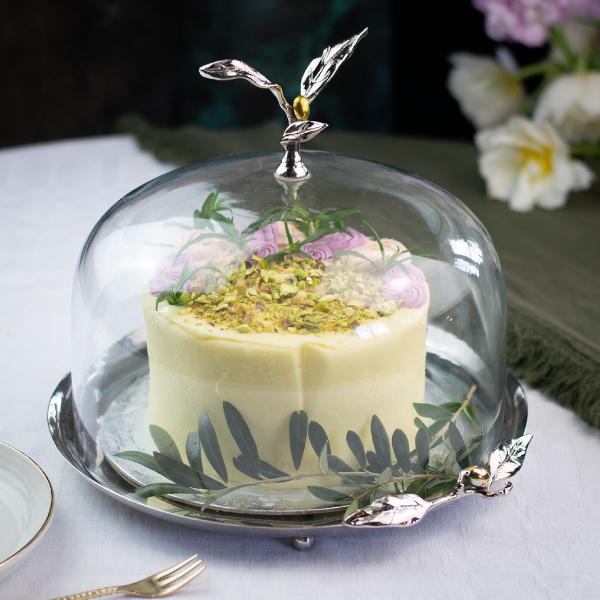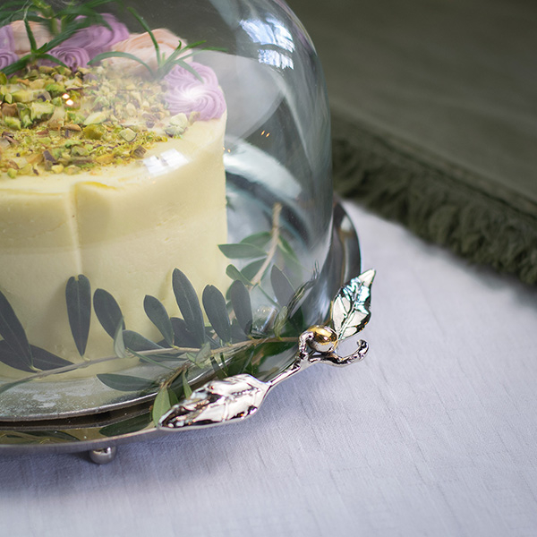 Our circular nickel finish cake stand with its glass dome – finished off with our olive leaf design – is a stunning way to showcase your showstopping cake to guests. The set could also be used for pastries, or perhaps cheeses, with the dome making it perfect for al-fresco dining.